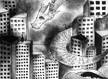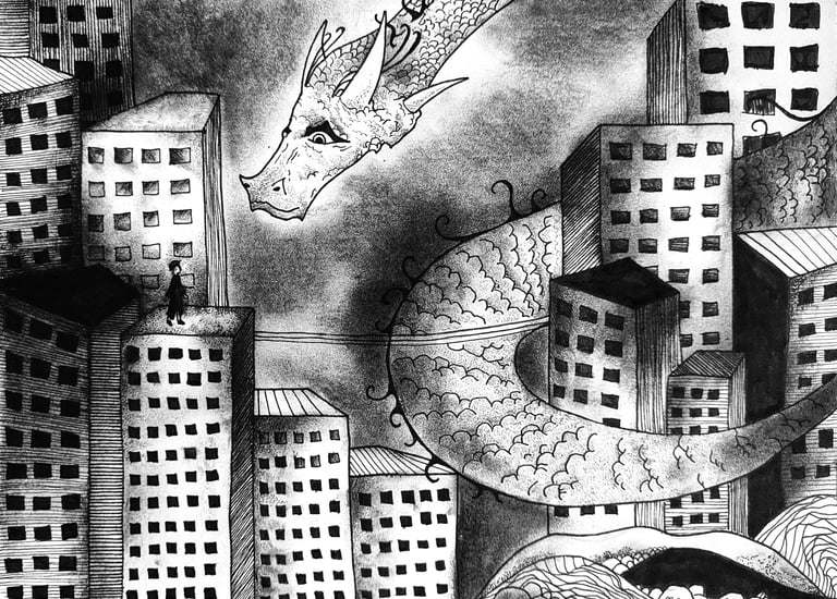 This subsection brings together the other side of my work: that of surrealist and fantasy qualities. The surreal ink drawings focus on atmosphere and detail, creating dreamlike worlds without the need for color. In contrast, the digital pieces embrace bold palettes, repetition, and texture, offering a vibrant, contemporary counterpoint.