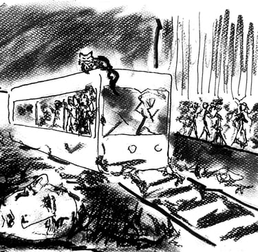 I explored several iterations—ranging from highly detailed renderings to digital drawings—but ultimately chose to use the original ink and charcoal sketches. Despite the intricacy of the other versions, none captured the essence of the work as powerfully as the rawness of the sketches, with all their textured "flaws".